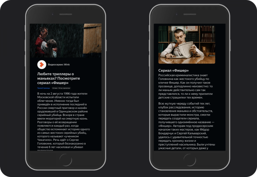 «Яндекса», их привлекала обложка с вовлекающим заголовком и изображением. Они кликали по объявлению и попадали в статью, где читали историю Фишера. В конце статьи был отдельный блок с рассказом о новом сериале, основанном на реальных событиях.