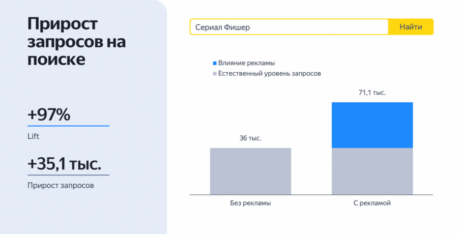 После чтения статьи заинтересованные пользователи начинали искать больше информации о сериале. В результате рекламной кампании поисковые запросы выросли на 97% по сравнению с контрольной группой, которая не видела рекламу.