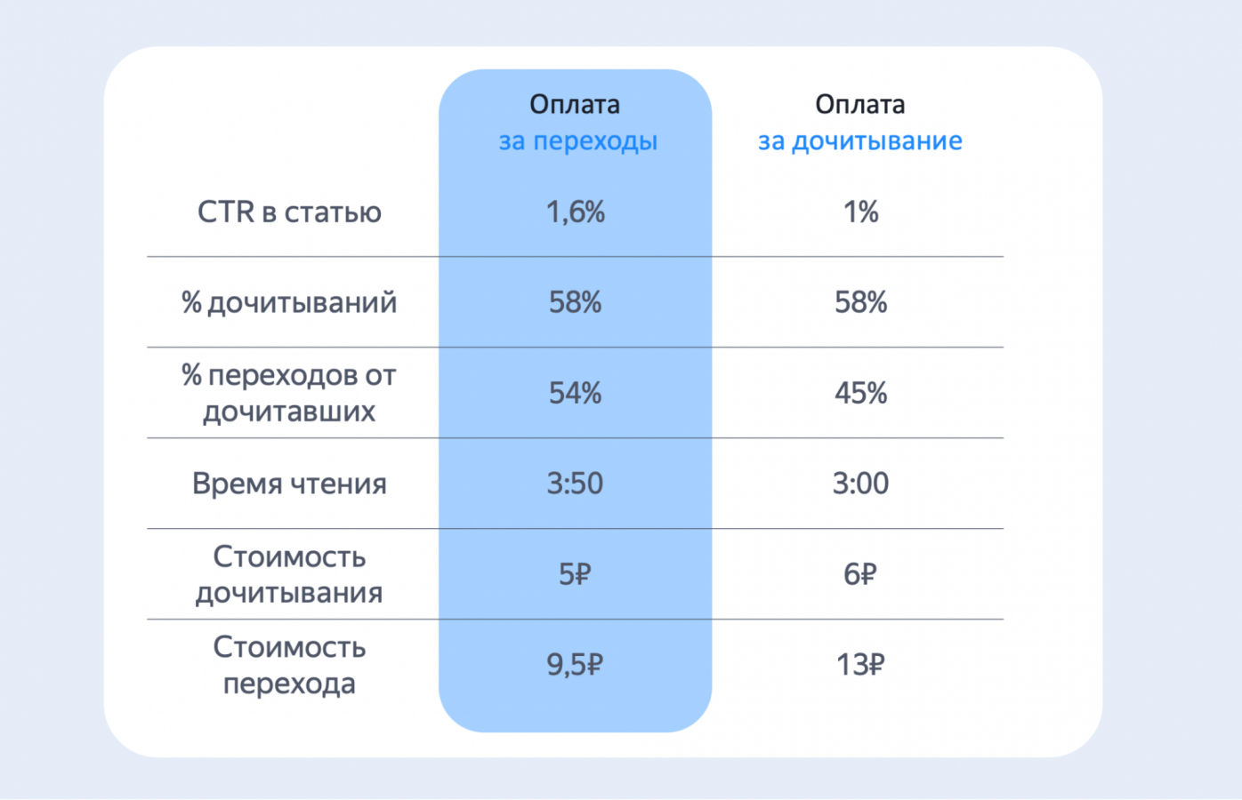 В случае с Wink в «ПромоСтраницах» лучше сработала рекламная кампания с оплатой за переходы на сайт. CTR был выше, а стоимость дочитывания и перехода — ниже. При этом время чтения занимало почти четыре минуты.
