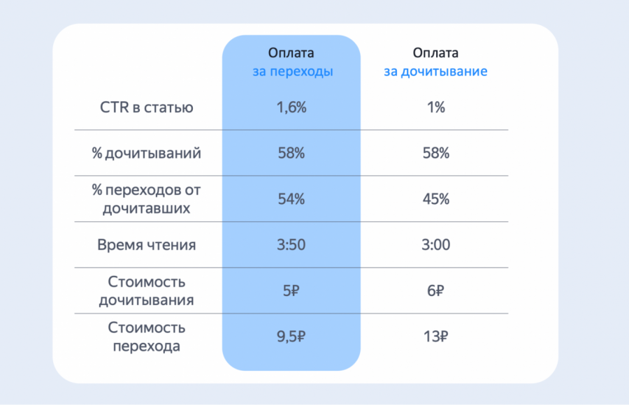 Кроме этого, отложенные конверсии (подписка на сервис) выросли на 141%, а визиты на сайт — на 93%. При этом стоимость дочитывания составила всего 5 руб., а переход на сайт — 11 руб.