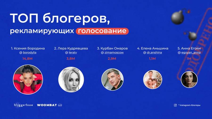 Компания BloggerBase составила рейтинг блогеров с многомиллионной аудиторией, согласившихся открыто прорекламировать поправки в Конституцию в своих Instagram-аккаунтах. Эксперты