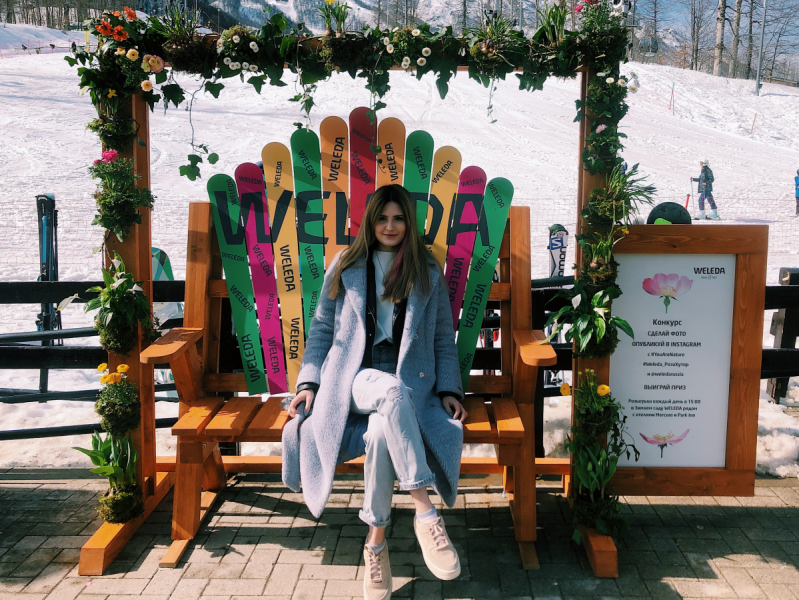 Ещё один конкурс проводился на вершине гор в верхней части базы Роза Хутор, где расположен горнолыжный курорт. Промоутер раздавал семплы и рассказывал, как можно избежать сухости рук и что делать при растяжении мышц. На фоне величественных гор мы оборудовали фотозону — брендированную скамейку с логотипом и, безусловно, в цветах. Надо было сфотографироваться, выложить фото в Instagram и поставить определенные хэштеги, после чего получить приз. С помощью этой активности на горнолыжном спуске мы охватили еще больше аудитории: и пешеходов, и сноубордистов, и лыжников.