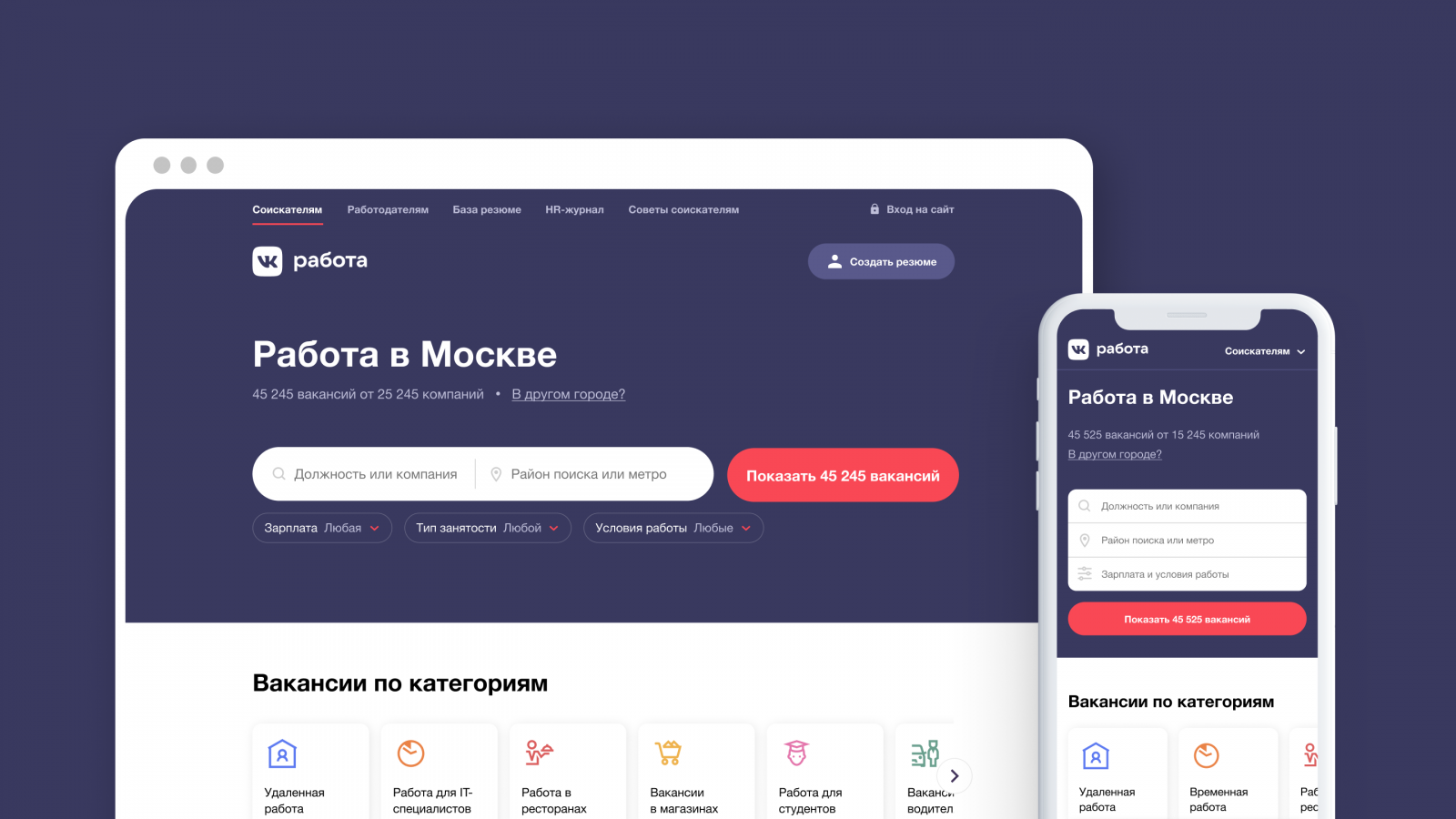 В 2020 году сервис стал доступен в соцсетях «ВКонтакте» и «Одноклассники», позволяя пользователям находить вакансии, откликаться, создавать резюме и проходить собеседования прямо в соцсети. «VK Работа» останется самостоятельным ресурсом, который продолжит развивать свой сайт, приложения и присутствие на других популярных ресурсах — в почте Mail.ru и сервисе объявлений «Юла».