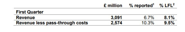 В отчёте компания также приводит выручку без учёта издержек (revenue less pass-through costs) — она составила £2,6 млрд, и показатель LFL (like-for-like), который используется для сравнения выручки за два года. Он отражает разницу финансовых результатов этого года, включая приобретения, и предыдущего года, скорректированных с учётом приобретений и ликвидаций. Таким образом, выручка WPP в первом квартале увеличилась на 8,1%.