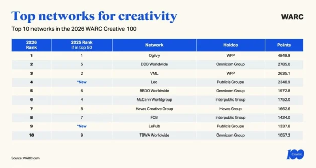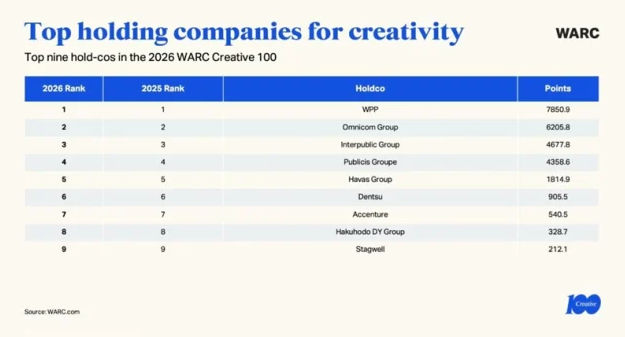 Четвертый год подряд WPP признана самой креативной компанией в списке WARC Creative 100 за 2026 год. Этот рейтинг ранжирует агентства и кампании, получившие наибольшее количество наград за креативность по всему миру.