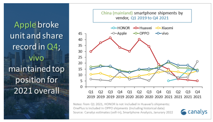 На глобальном рынке по итогам четвертого квартала лидировала Apple, тогда как во втором квартале производитель Huawei стал лидером по поставкам смартфонов. К концу года доля китайского производителя резко снизилась, тогда как яблочная компания продемонстрировала рост на 40%.