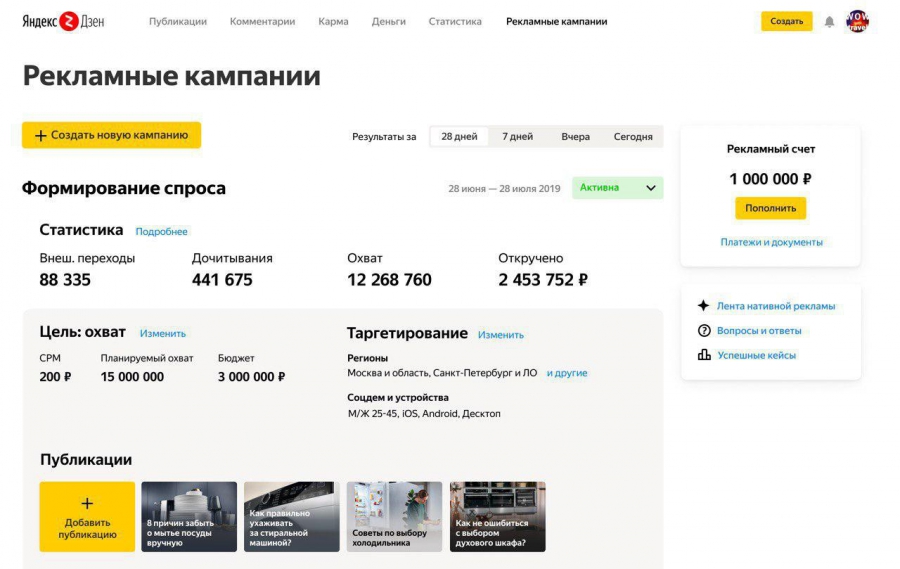Дмитрий Попов: Да, при создании рекламной кампании клиент сразу увидит две возможности: вовлечение, с оптимизацией дочитываний, и охват. Здесь же сервис даст прогноз по кампании. Как только кампания запустится, клиент увидит статистику — сколько пользователей дочитали, время чтения каждой публикации, общий охват и другие промежуточные показатели. Кроме того, рекламодатель сможет поставить счётчик Яндекс.Метрики и пиксели Яндекс.Аудиторий и по ним изучать поведение пользователей более детально.