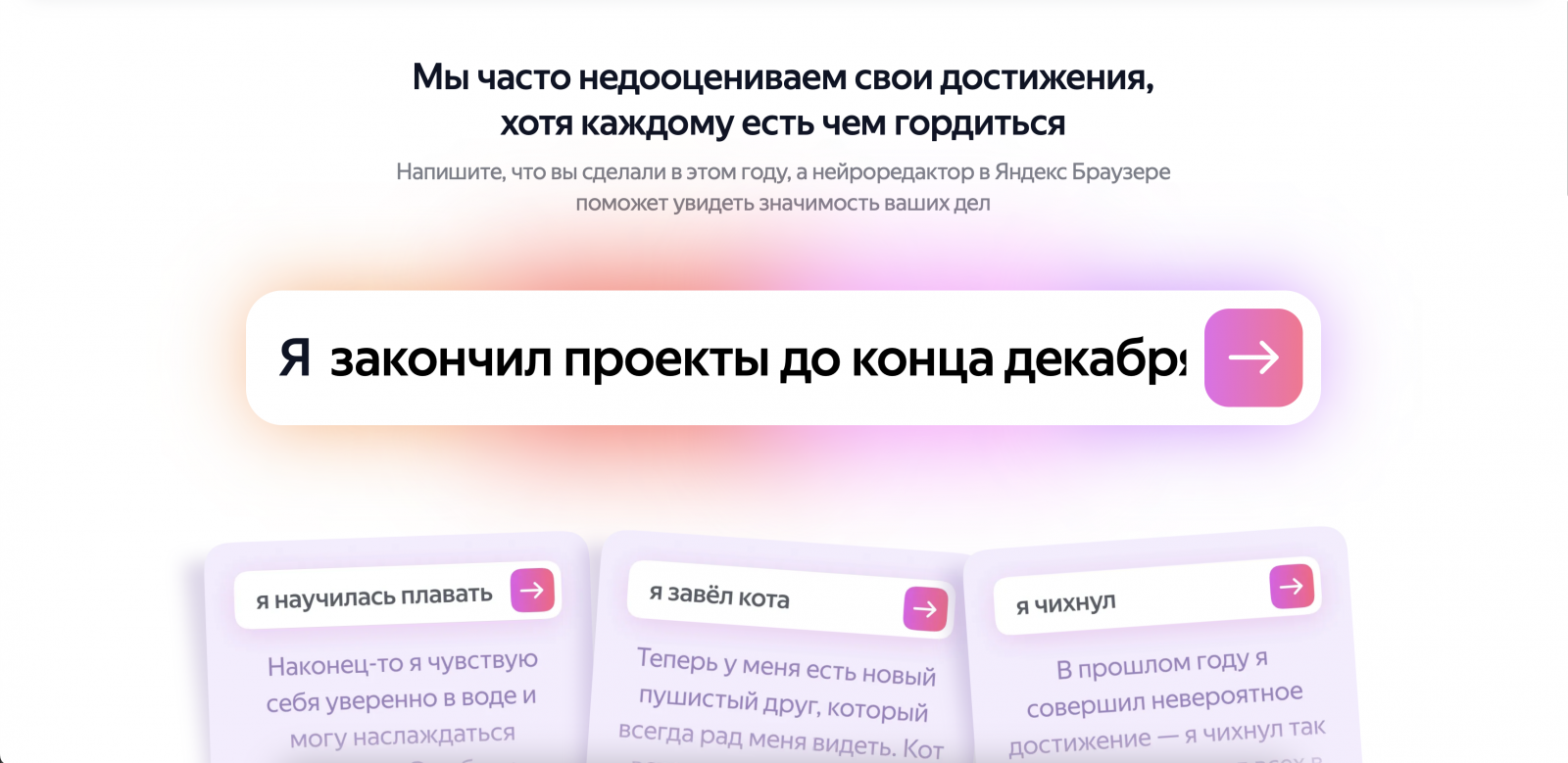 Эмоциональным центром проекта стала специальная адаптированная версия нейроредактора от «Яндекс Браузера». Она обучена, чтобы помогать людям формулировать свои достижения и замечать повод для гордости в обычных, на первый взгляд, событиях.