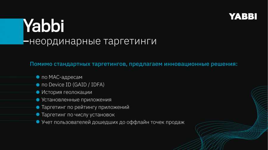Миссия YABBI — это создание безопасной прозрачной среды в in-app для медийной рекламы любых брендов согласно концепции «инвентарь-креатив-данные». YABBI DSP — уникальный медиаинструмент для брендов в in-app инвентаре. Мы рады представить рекламному рынку не имеющую аналогов in-app DSP, созданную для получения максимально качественных медийных KPI. Ниже мы расскажем о ряде наших ключевых возможностей для рекламодателей.