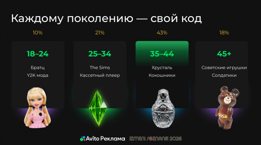 Ностальгический код не универсален — он привязан к возрасту. Основной объем запросов (43%) генерирует аудитория 35−44 лет: хрусталь, кокошники, вещи из детства 80−90-х. За ними следует сегмент 25−34 (21%): The Sims, кассетный плеер. Молодежь 18−24 (10%) ностальгирует по совсем другим вещам — куклам Братц, Y2K-моде, эстетике нулевых, которую они знают скорее по видеоплатформам, чем по живой памяти.