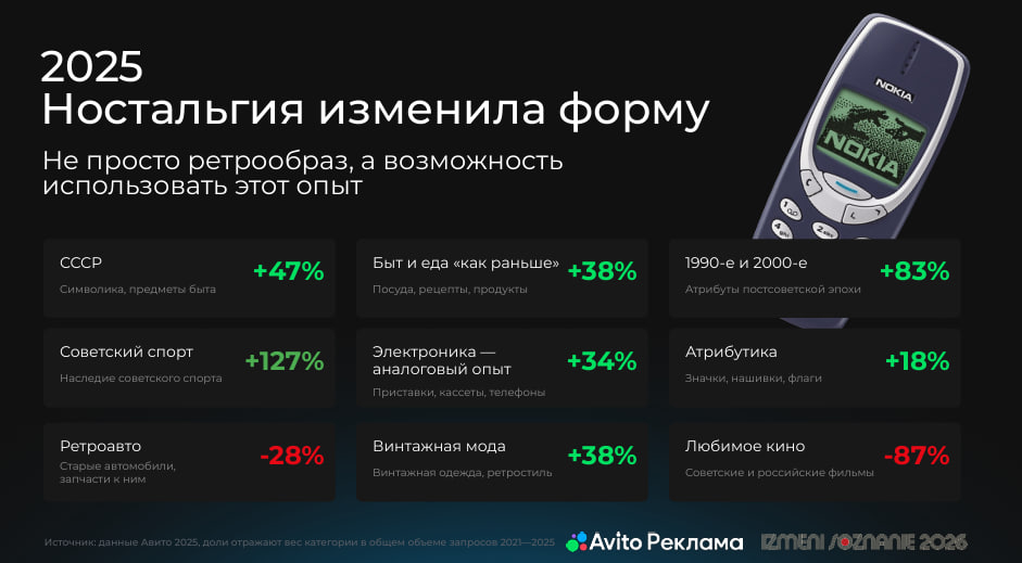 Важно и то, по чему именно скучают. За 2021−2025 годы структура ностальгического спроса на «Авито» существенно изменилась. Одни категории выросли кратно: товары по тематике «советский спорт» +127%, атрибуты 90-х и 2000-х — +83%, быт «как раньше» (посуда, рецепты, продукты) — +38%. Другие просели: например, поиски ретроавтомобилей упали на 28%.