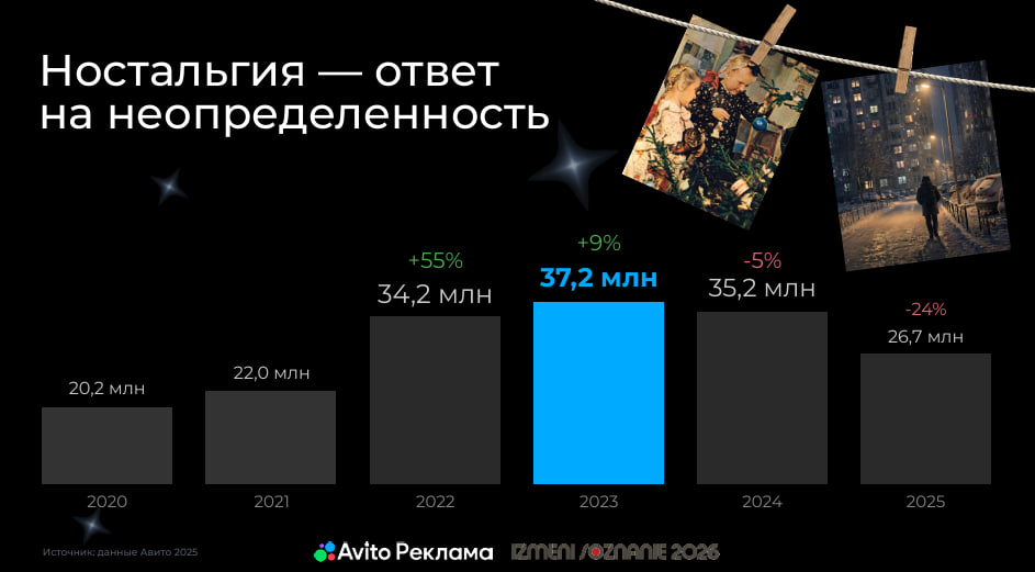 На «Авито» это видно в цифрах. В 2025 году пользователи совершили почти 26,2 млн поисковых запросов по товарам, которые вызывают чувство ностальгии. Но важнее не абсолютные числа, а динамика.