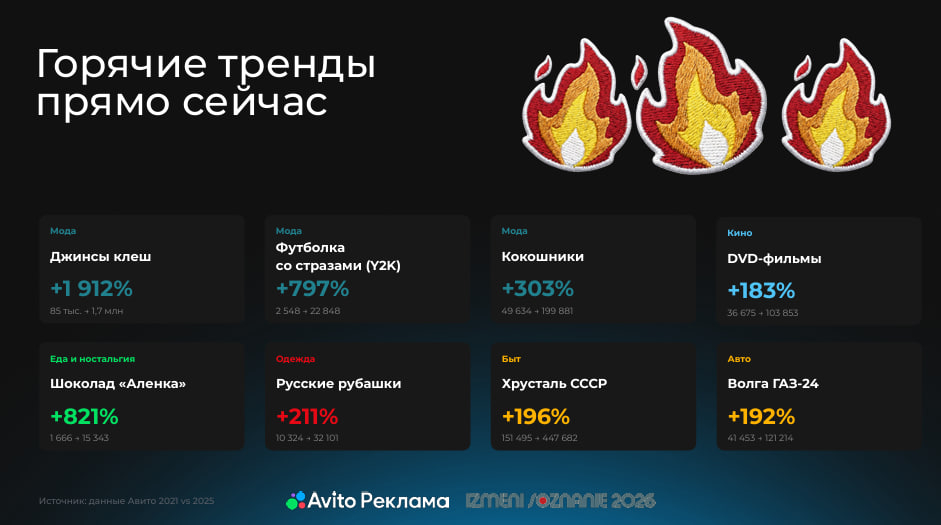 Данные «Авито» фиксируют несколько резких скачков. Джинсы клеш: спрос на них вырос с 85 тысяч запросов до 1,7 миллиона — рост на 1912%. Шоколад «Аленка»: + 821%. Советский хрусталь: + 196%. DVD-фильмы: + 183%. Волга ГАЗ-24: + 192%.
