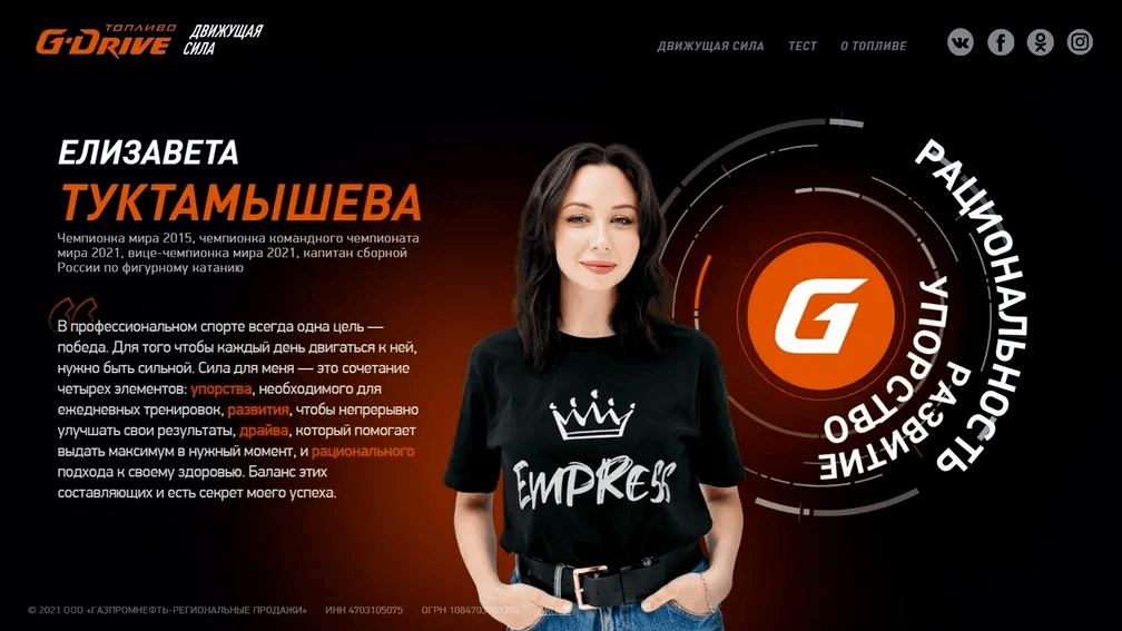 К 2021 году бренд G-Drive успел накопить внушительные спортивные активы. Многие из них были задействованы на новой посадочной странице. Ее задачей стало раскрытие обновленного позиционирования и стимулирование к участию в рекламной акции на АЗС сети «Газпромнефть». Елизавета Туктамышева, а вместе с ней чемпионка мира по ралли рейдам Анастасия Нифонтова, чемпион мира по гонкам на выносливость Роман Русинов, полузащитник сборной России по футболу Александр Головин и нападающий ХК «Авангард» Сергей Толчинский рассказали, что является движущей силой для них. В выбранных ими вдохновляющих идеях легко считываются параллели с ключевыми характеристиками бренда. Посетителям сайта предлагается пройти тест и узнать, какая из составляющих движущей силы им ближе.