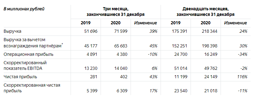 Годовая консолидированная выручка компании выросла на 24% год к году и составила 218,3 млрд руб. Чистая прибыль подскочила на 116%, до 24,1 млрд руб. Без учета «Яндекс.Маркета» годовая выручка увеличилась на 17%, до 206,0 млрд руб. Чистая прибыль снизилась на 16% и составила 13,0 млрд руб.