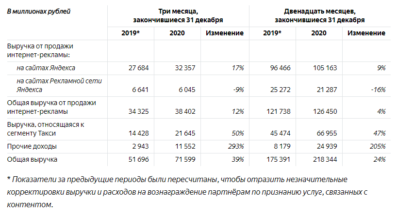 За четвертый квартал 2020 года выручка от интернет-рекламы выросла на 12% и составила 54% от общей выручки компании. Без учета «Яндекс.Маркета» доход вырос на 4% по сравнению с четвертым кварталом 2019 года. Компания начала учитывать показатели «Яндекс.Маркета» с 24 июля 2020 года, когда вновь стала его основным владельцем.
