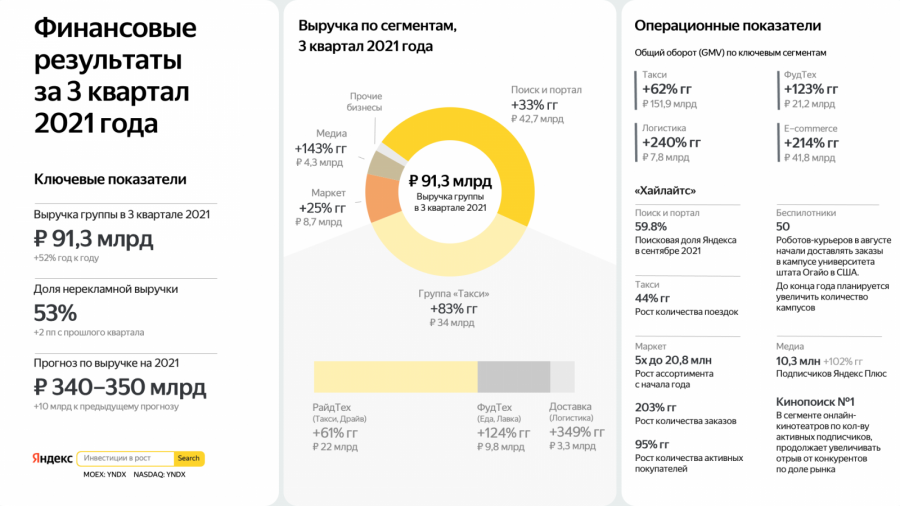 «Яндекс» представил неаудированные финансовые результаты за третий квартал 2021 года с учётом результатов «Яндекс.Маркета», который компания получила в июле 2020 года. Общая выручка компании за этот период составила 91,3 млрд руб. — это на 57% больше, чем годом ранее.