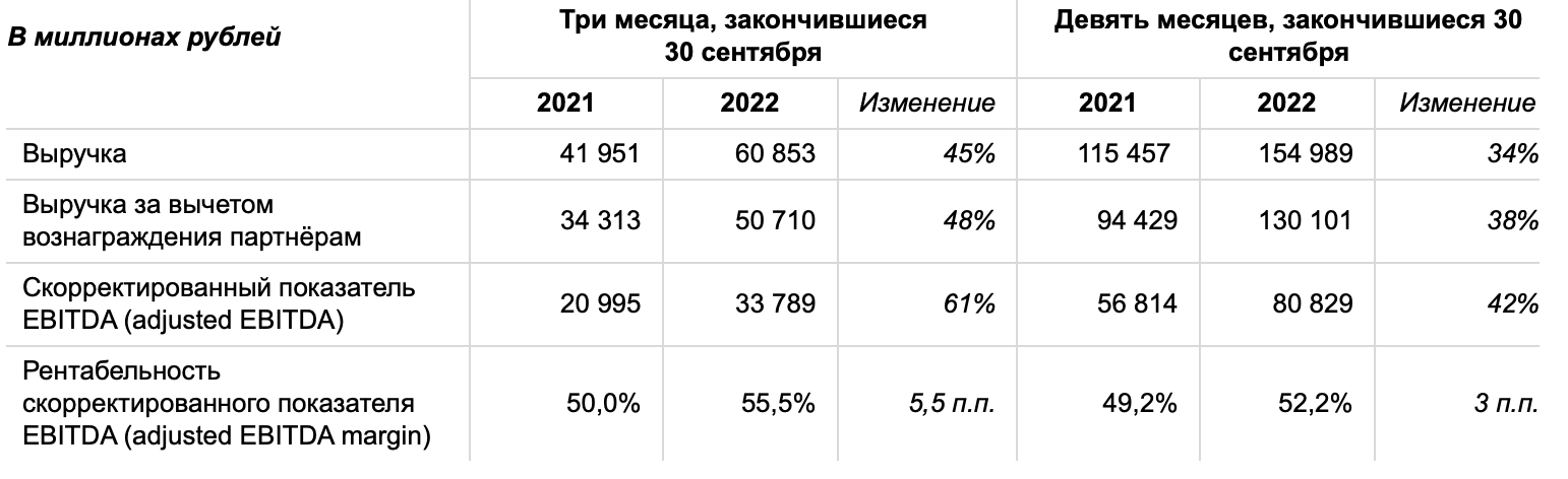 Товарооборот на сервисах электронной коммерции («Маркет», «Лавка» в России и доставка продуктов в «Еде») в третьем квартале вырос на 73% по сравнению с аналогичным показателем за третий квартал прошлого года, составив 72,5 млрд руб. За девять месяцев показатель увеличился почти в два раза и достиг 195,6 млрд руб. Delivery Club стал частью бизнеса «Яндекс» 8 сентября 2022 года. Показатели сервиса отражены в отчётности «Яндекса» только с даты закрытия сделки.