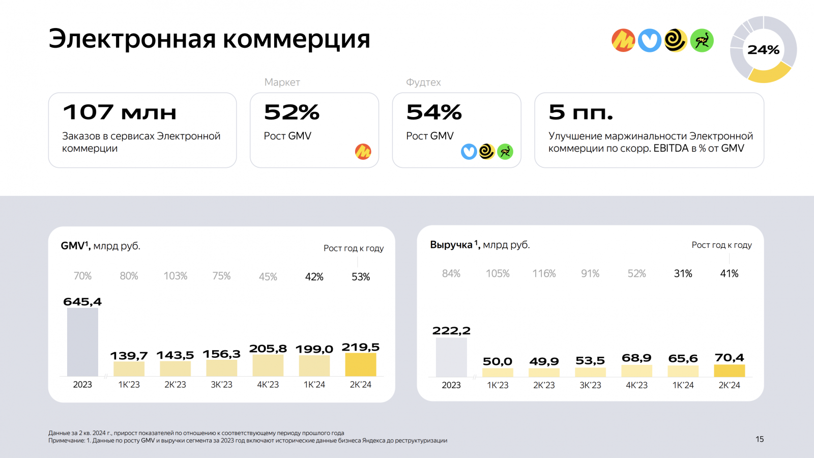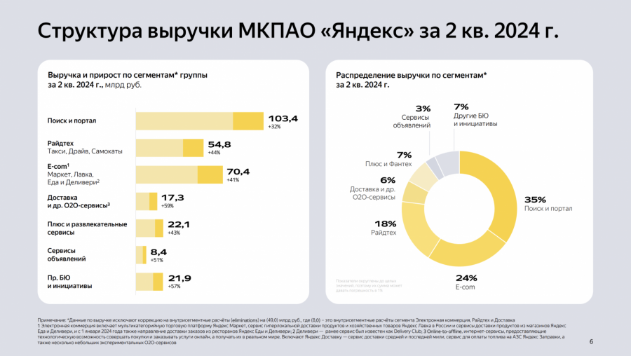 Напомним, выручка «Яндекса» во втором квартале 2024 года выросла на 40%, до 228,3 млрд руб., в основном за счет роста доходов в сегментах «Поиска и портала» (34%), e-commerce (24%) и райдтеха (17%).