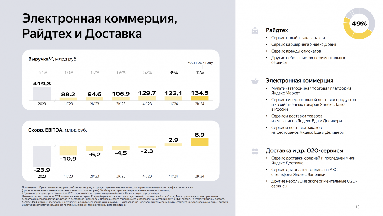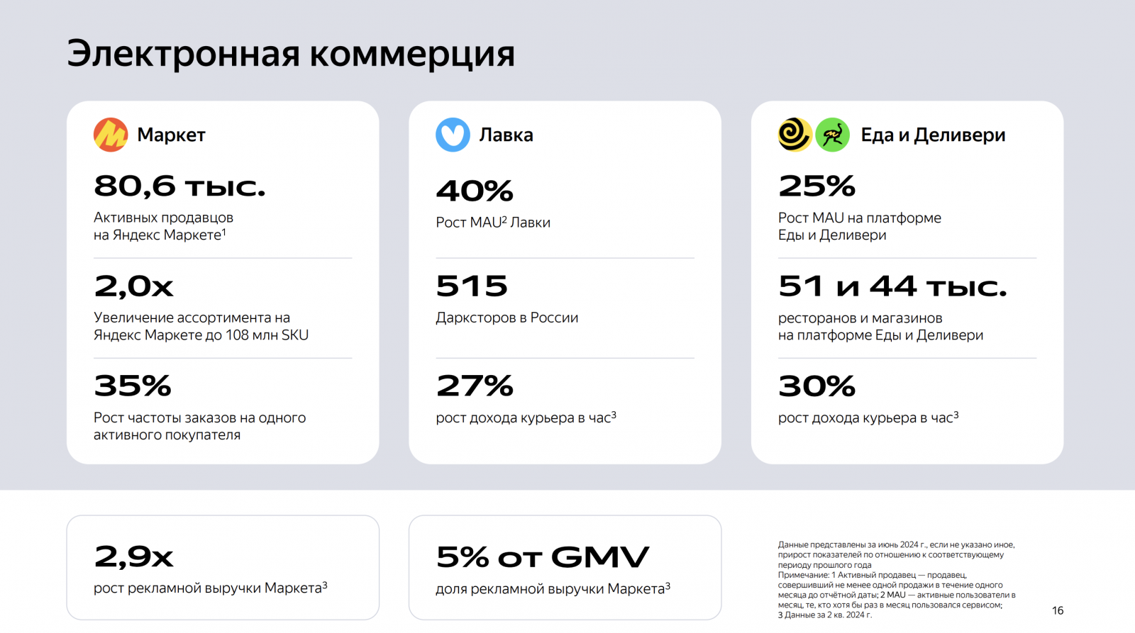 Выручка «Яндекса» в сегменте электронной коммерции, райдтеха и доставки (GMV; входят в том числе «Маркет», «Лавка» в России и доставка продуктов в «Еде» и «Маркет Деливери») выросла на 42% год к году, до 134,5 млрд руб. Рост произошел в основном за счёт сервисов райдтеха и e-com, где наибольший вклад в увеличение выручки внесла «Лавка», а следом за ней — «Еда» и «Деливери».
