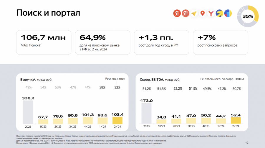 «Поиск и портал» остается основным источником дохода компании. Его доля в структуре выручки составляет 35%.