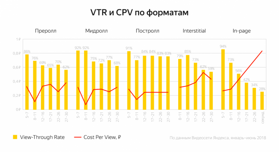 По итогам первого полугодия полный досмотр ролика в Видеосети Яндекса обходился рекламодателю в среднем в 29 копеек за преролл, 25 — за мидролл, 23 — за постролл и 51 — за in-page. Стоимость полного досмотра роликов одинаковой длины отличается на разных устройствах. Дешевле всего рекламодателям обходится показ ролика длиной от 8 до 11 секунд — в среднем 11 копеек на десктопе и 12 копеек на мобильных устройствах. При этом показатель досмотров у таких роликов относительно высок: 77% на десктопе и 74% на мобильных.