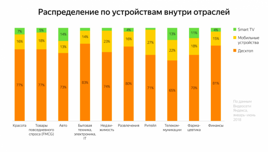 Большая часть видеорекламы во всех отраслях приходится на десктопы. Трафик сильно сконцентрирован на экранах больших форматов. Доля мобильной рекламы высока в ритейле (27%) и недвижимости (23%). По доле рекламы на Smart TV лидируют авто и телеком-индустрии (14% и 13% соответственно); третье место — у фарминдустрии (11%).