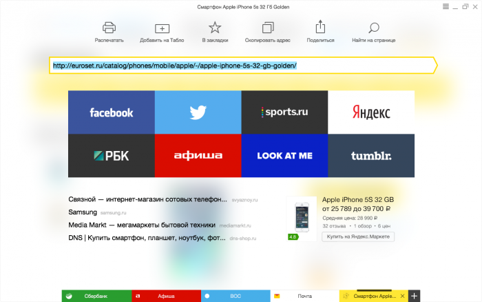 Для более любопытных пользователей Яндекс добавил опцию «Изнанка» сайта. Изнанка - это название экрана с дополнительной информацией. Он откроется, если нажать на заголовок страницы. Изнанка содержит список действий со страницей (например, «распечатать» или «поделиться»), Умную строку и Табло, а также отображает сведения, связанные с содержанием сайта. Так, если вы зашли на сайт интернет-магазина, на «Изнанке» вы увидите ссылки на другие магазины с похожим ассортиментом товаров.