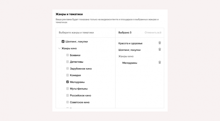 Подобный таргетинг позволяет охватить аудиторию в тех случаях, когда это сложно сделать по характеристикам пользователя: социально-демографическим, поведенческим и другим. Например, если в браузере удалены файлы cookie или используется режим инкогнито. Выбрать можно только один из двух вариантов таргетинга: тематический или по профилю пользователей.