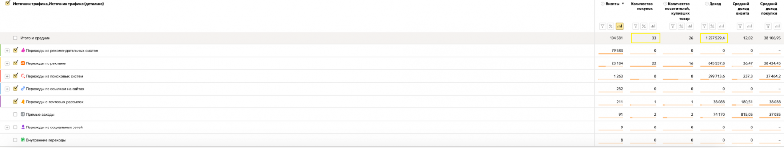 В этом отчете видно, что мы заработали 1,25 млн на 33 ассоциированных конверсиях. Конверсии выделены желтым: