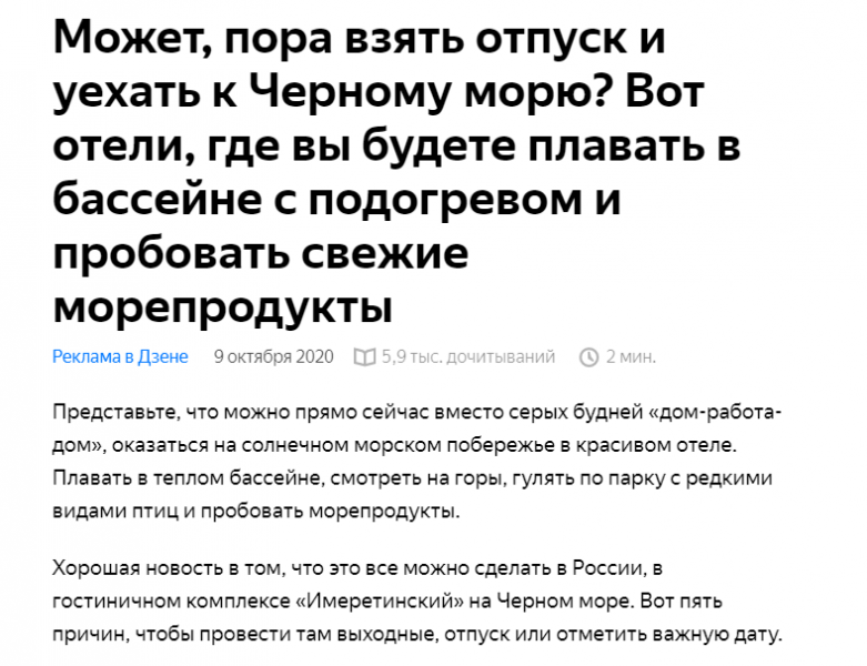 3. «Может, пора взять отпуск и уехать к Черному морю? Вот отели, где вы будете плавать в бассейне с подогревом и пробовать свежие морепродукты». В этой статье мы активно использовали эмоциональные слова вроде «представьте», развеивали сомнения и страхи читателей. Например, рассказали, что отель на берегу моря, и не нужно ехать 20 минут в автобусе до пляжа, а аниматор займет детей, пока вы плаваете в бассейне. Мы не продавали комплекс «Имеретинский» читателю «в лоб» — просто рассказывали, с какими проблемами часто сталкиваются туристы и как наш бренд их решает. Статья оказалась самой удачной и принесла рекордное количество дочитываний — 33 тыс.