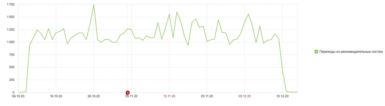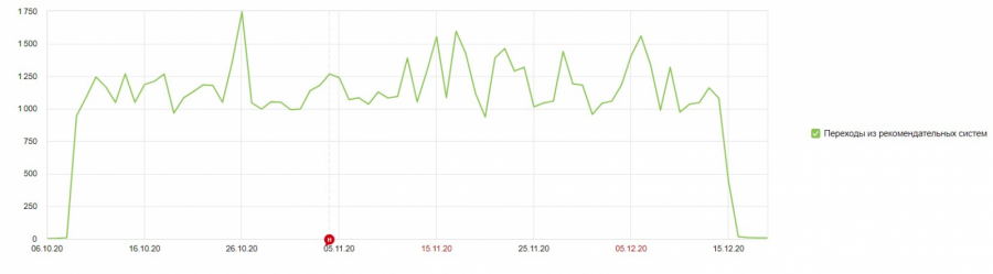 Зеленым цветом на графике ниже выделены отложенные переходы из рекламных статей в «Дзене» на наш сайт. Шкала с цифрами слева показывает количество визитов. Эти пользователи прочитали статью, но на сайт перешли позднее — через поисковик или другой источник, а не по ссылке из рекламной статьи. Всего мы получили 79 тыс. таких переходов на сайт.