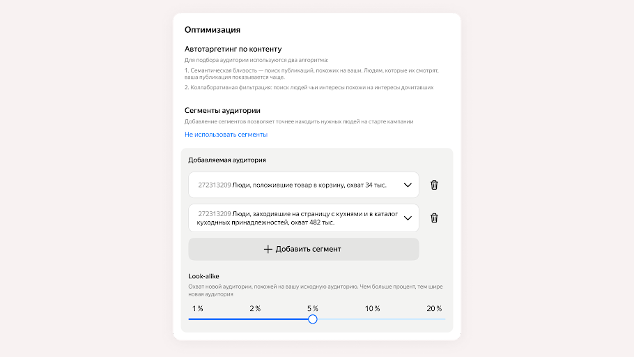 В кампаниях, таргетированных на дочитывания, функция look-alike по сегментам улучшит качество запуска, добавляют в «Дзене», а в охватных кампаниях рекламодатели смогут оптимизировать показы настройками точности похожей аудитории.