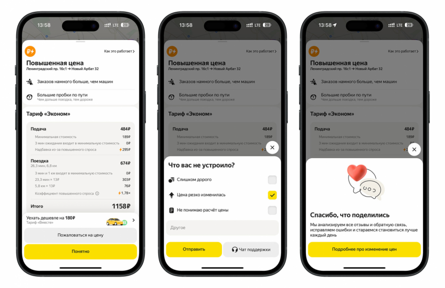 В начале декабря в приложении «Яндекс.Go» появилась детализация цен на поездки в такси, где указаны стоимость подачи машины, суммарная стоимость минут и километров по маршруту, надбавки за повышенный спрос и стоимость дополнительных опций. Чтобы увидеть детализацию и оставить обратную связь на цену, нужно нажать на значок рубля в левом верхнем углу экрана смартфона после выбора тарифа и маршрута поездки.