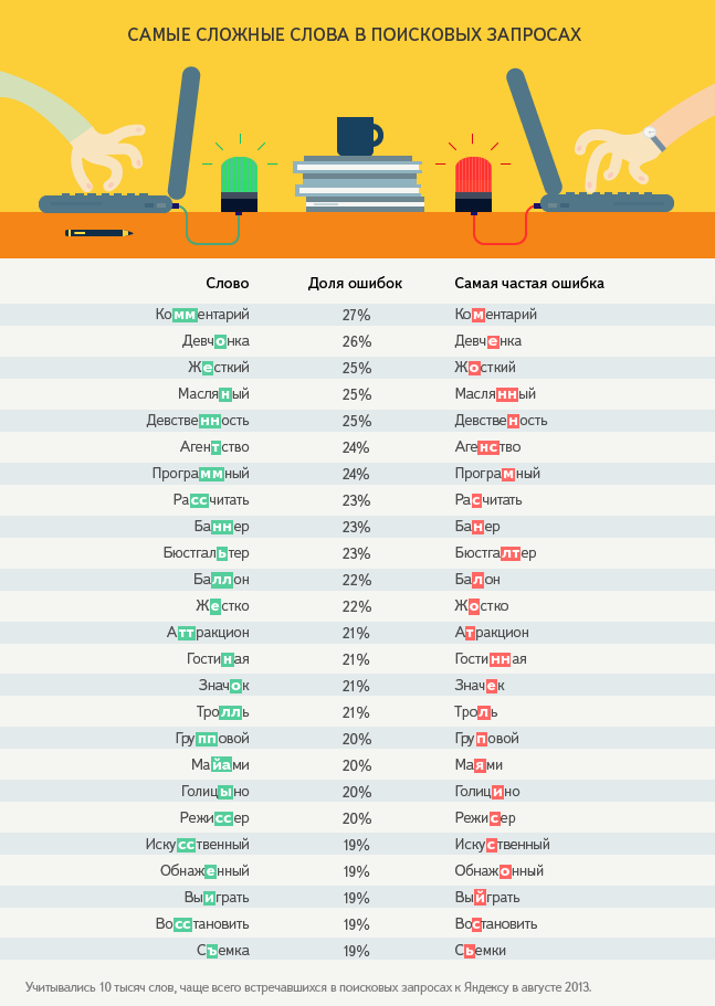 Из десяти тысяч самых часто используемых в поиске слов в августе 2013 года чаще всего ошибались в словах «комментарий», «девчонка» и «жесткий». Те или иные ошибки при написании этих слов совершали в каждом четвёртом случае.