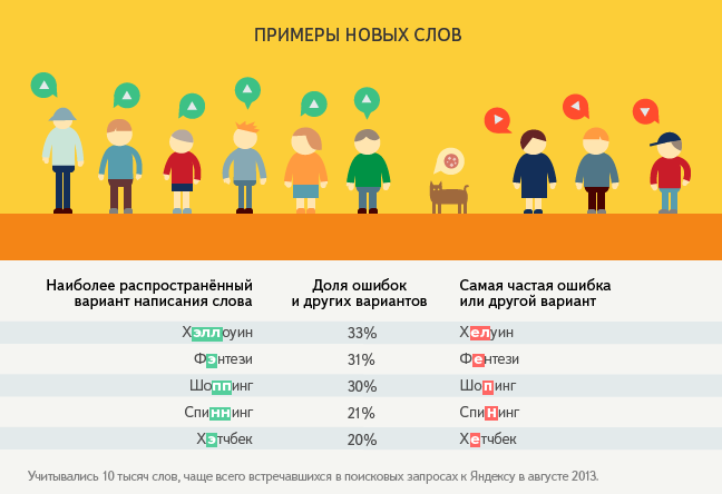 Если относительно новое слово имеет несколько вариантов написания, то поиск «Яндекса» ориентируется на статистику запросов, автоматически определяет самый частотный вариант и предлагает исправления для менее распространенных вариантов.