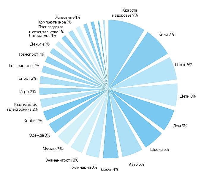 "Яндекс" также выделил около тридцати тем поисковых запросов, каждая из которых отвечает за одну из больших сфер действительности — от животных до бизнеса. Среди них только пять ищут примерно одинаково на всех устройствах: это авто, досуг, компьютеры и электроника, литература и транспорт. Остальные характерны для одних устройств больше, чем для других. Так, для компьютера характерны ИТ, производство и строительство, игры. Для планшета — дом, знаменитости, кулинария. Для телефона — эзотерика, отношения и порно.