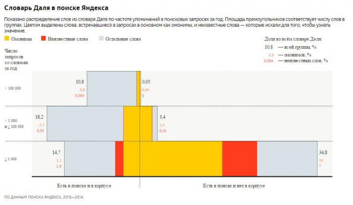 В поисковых запросах к «Яндексу» встречаются почти 160 тысяч слов из тех 200 тысяч, которым Даль дал толкование. Около половины из найденных — живые слова: к ним постоянно прибегают при поиске. Вторая половина — «уходящие»; они либо появляются в запросах крайне редко, либо люди ищут их в основном для того, чтобы узнать значение: [хлудец это], [что такое прокоробить].