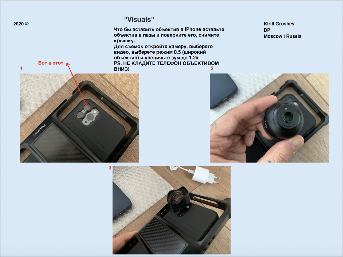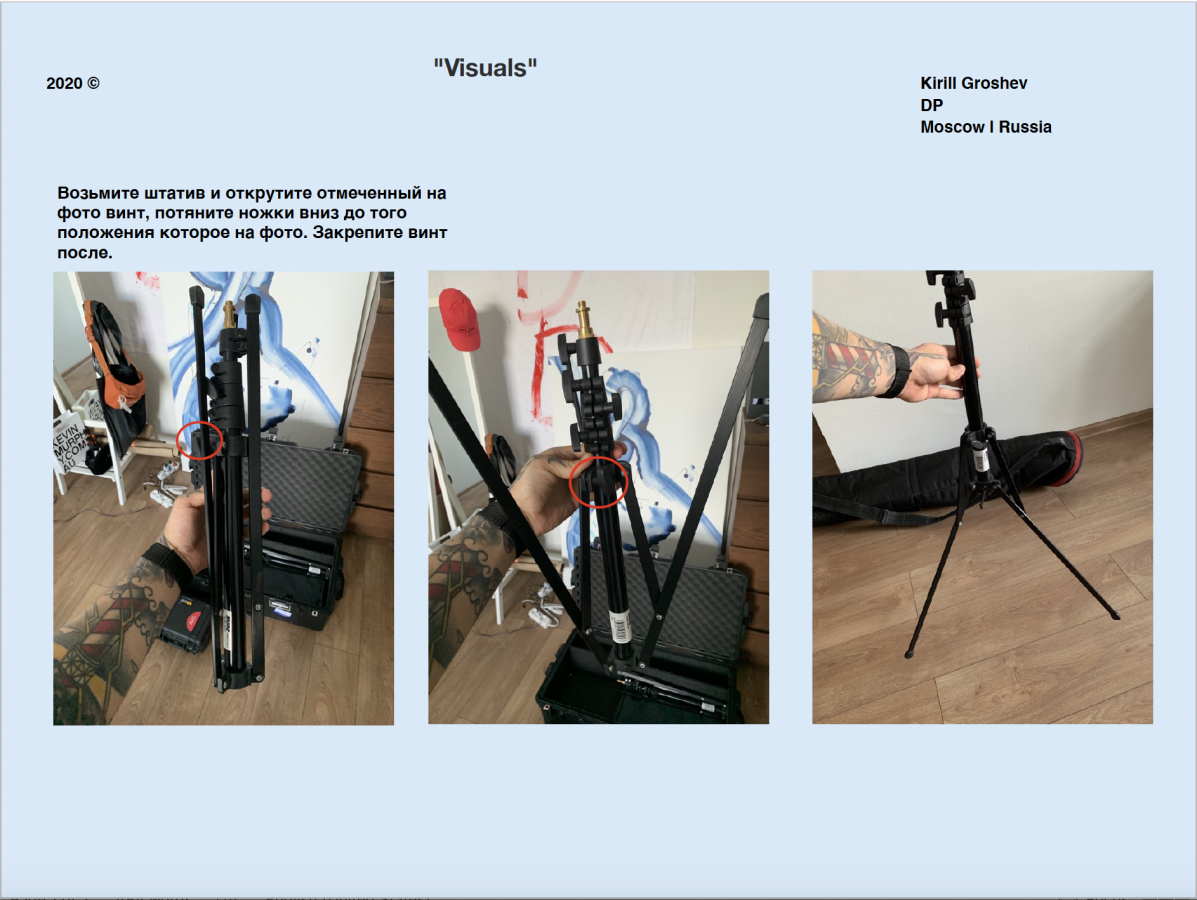Съемки проходили на iPhone 11 Pro Max, но с дополнительной оптикой. Всю технику, включая портативные световые приборы, актёры получали заранее перед съёмкой. Также они получали подробную иллюстрированную инструкцию того, как установить свет, как собрать камеру. Для удобства актёров ракурсы для съёмок были заранее смоделированы в 3D. Во время съёмок был полноценный плейбек: экран через AirPlay транслировался в видеоконференцию режиссерской «палатки».