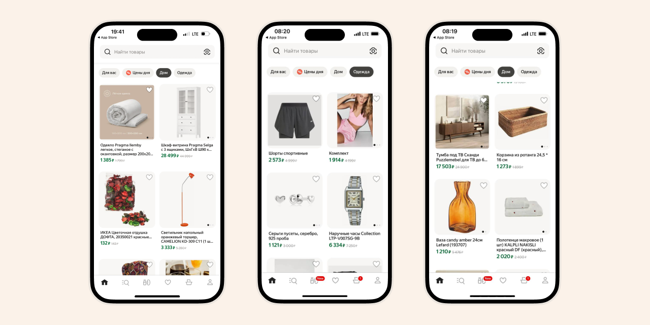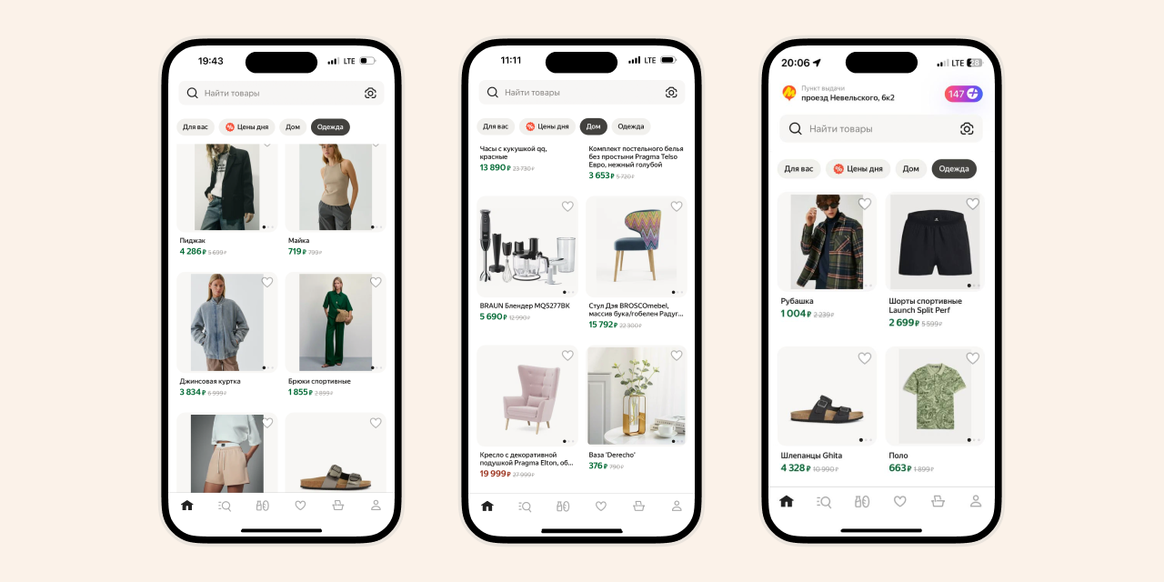 Посмотреть рекомендуемые нейросетью товары можно на главной странице в приложении «Маркета» — во вкладках «Одежда» или «Дом». Подборки формируются на основе прошлых заказов покупателя, понравившихся ему товаров, поисковых запросов и размера одежды.