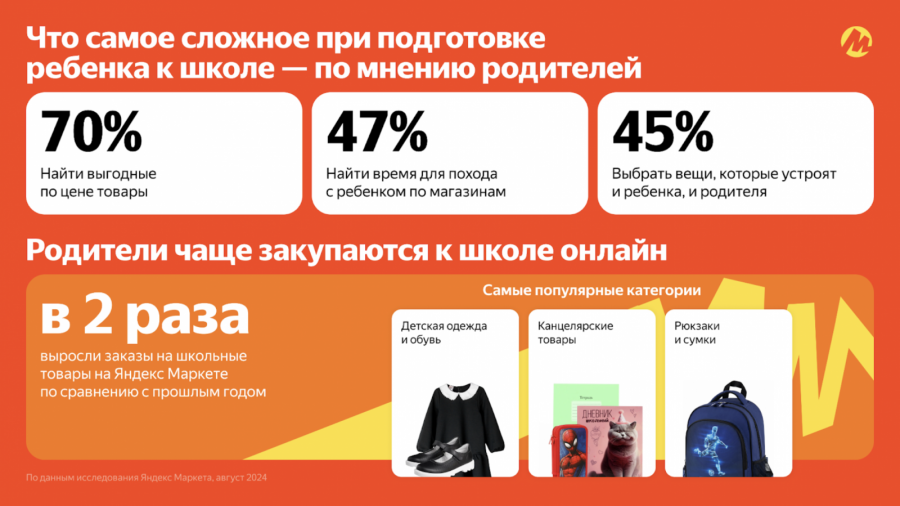 Большинство опрошенных россиян (70 %) назвали ключевой задачей перед 1 сентября поиск товаров с выгодными ценами. В этом году меньше родителей боятся не уложиться в запланированный бюджет, чем в 2023 году — 24% против 35% соответственно. Таковы данные опроса «Яндекс Маркета», его результаты есть в распоряжении Sostav.