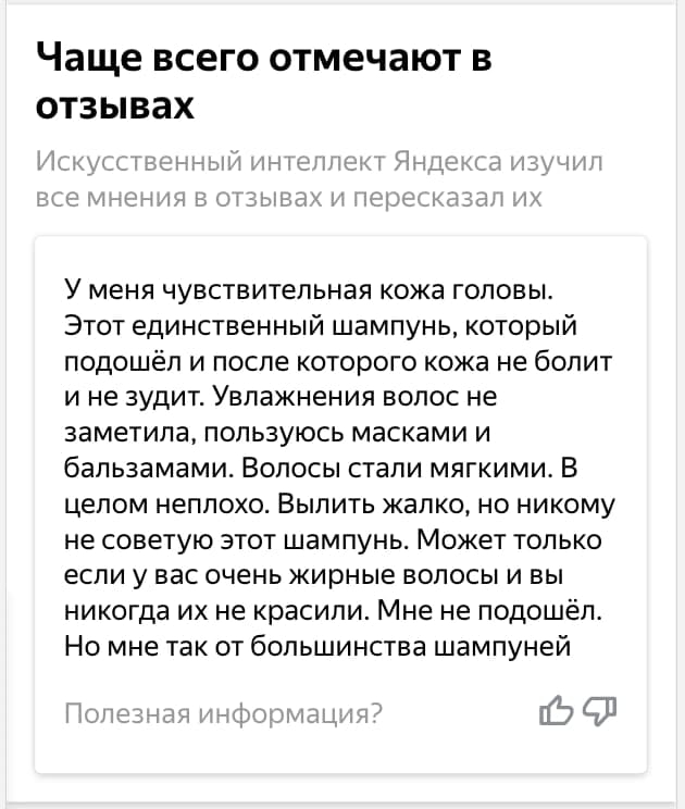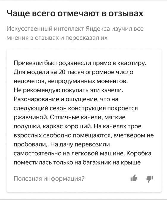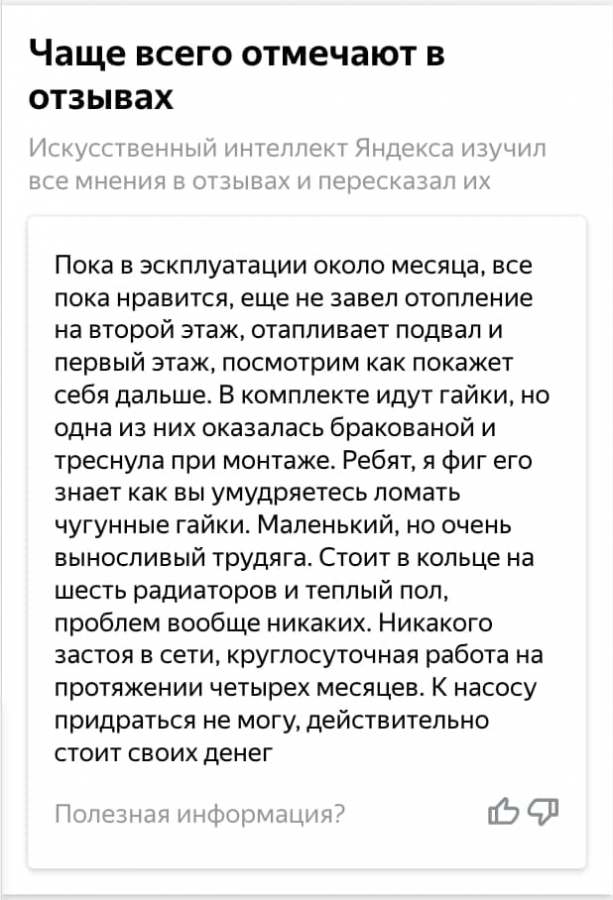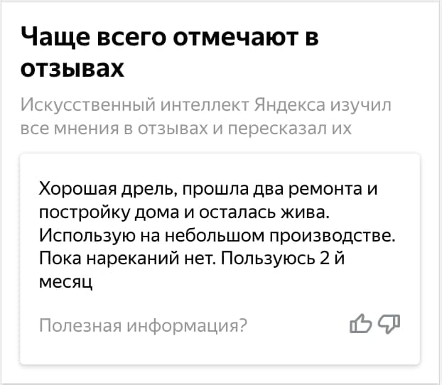 Умные отзывы состоят из двух частей: подробного комментария о товаре и набора ключевых характеристик, которые чаще всего отмечают пользователи, — например, качество сборки, дизайн и удобство, уровень шума. Составлять отзывы сервису помогает обученная «Яндексом» нейросеть. Она собирает мнения покупателей, находит в них совпадения и на их основе создает обобщенный отзыв.