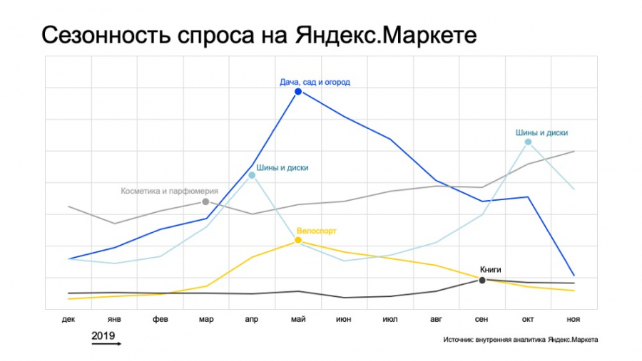 Некоторые товары начинают пользоваться повышенным спросом в определенные сезоны. Категории с самыми сильными сезонными всплесками интереса: велоспорт, дача, сад и огород, косметика и парфюмерия, книги, шины и диски.