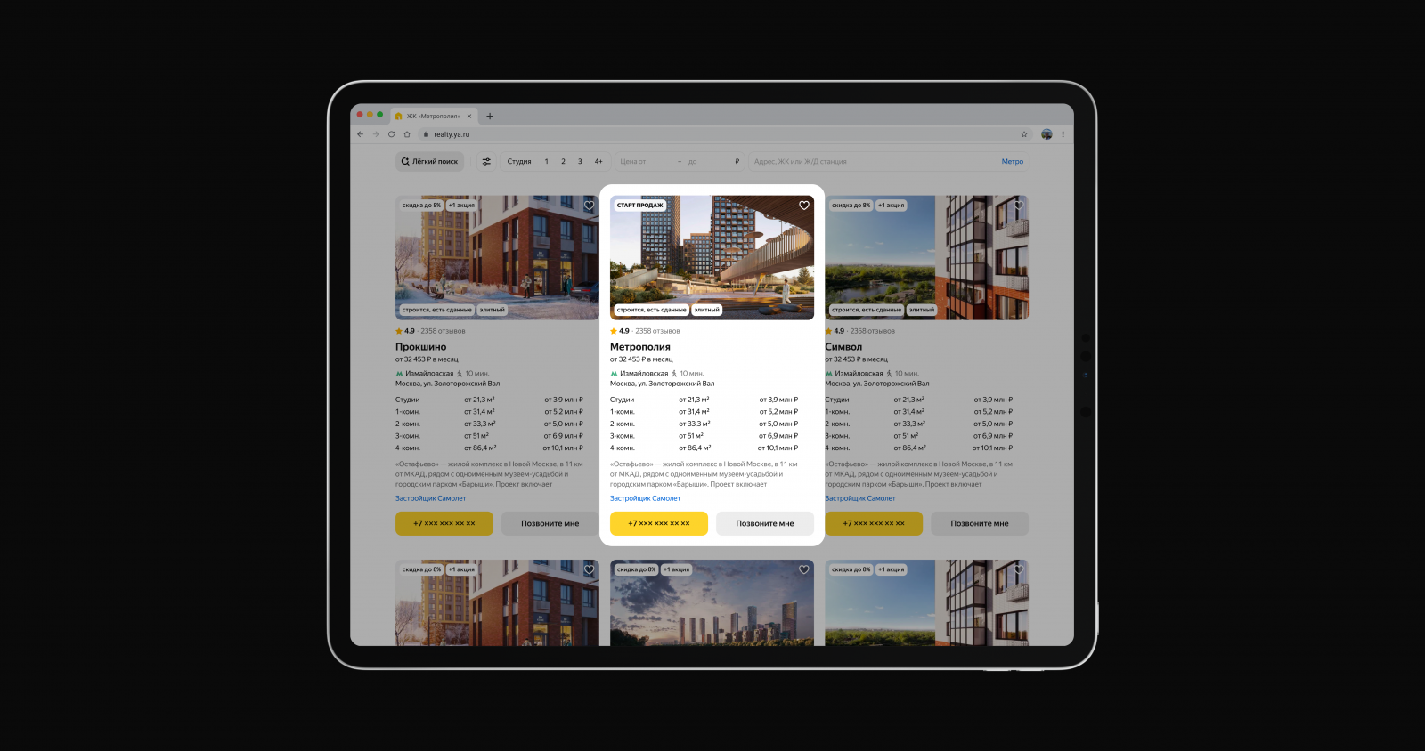 Кампании в «Старте продаж» также помогут проинформировать о вводе нового ЖК потенциальных клиентов, которые ранее интересовались этим комплексом на сайте Яндекс Недвижимости. Эта аудитория пользователей получит сообщения в WhatsApp, e-mail рассылку и push-уведомление о начале продаж или получит информацию в телефонном звонке. По результатам тестирования инструмента, поддержка «Старта продаж» в каналах «Яндекс Недвижимости» дает дополнительный охват целевой аудитории и помогает в первые 2 недели получить больше звонков (до 56%) от потенциальных клиентов.