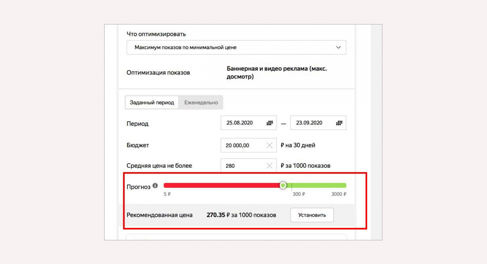 При создании и редактировании креатива рекламодатель может выбрать настройку «непропускаемое видео». Такой формат стоит дороже других, поэтому «Директ» перестроит прогноз ставок для участия в аукционе и подскажет цены, которые необходимы для размещения формата с учетом новой настройки и выбранных таргетингов.