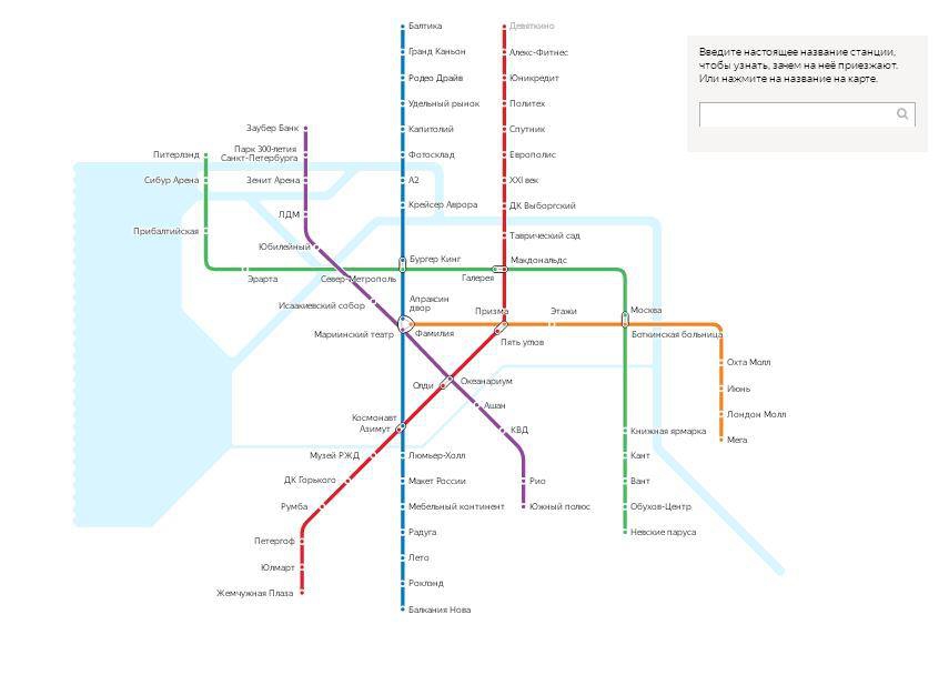 В «Яндексе» переделали карту не только московского, но и петербургского метро. Некоторые станции в двух городах оказались одноимёнными, только теперь это не «Достоевская» или «Маяковская», как раньше, а, например, «Мега», «Лето» и «Кант».