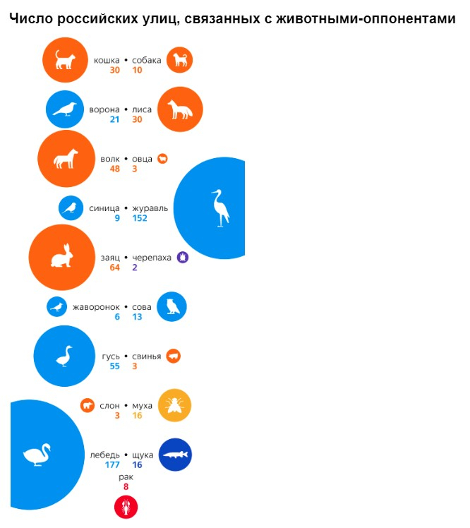 Аналитики «Яндекс Карт» также собрали несколько пар и троек животных-оппонентов и сравнили число связанных с ними улиц. Оказалось, что «кошачьих» улиц в три раза больше (30), чем «собачьих» (10), совы в названиях встречаются в два раза чаще жаворонков (13 против 6), а муха на карте России в пять раз заметнее слона. Лиса в очередной раз победила ворону (30 против 21), черепахе не удалось обогнать зайца (2 против 64), а лебедь взял верх над раком и щукой (177, 8 и 16 соответственно).