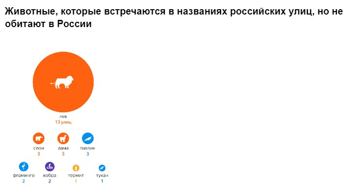 Почти все попавшие в названия улиц животные обитают на территории России в диком или одомашненном виде. Исключений всего восемь, самое заметное — лев (30 раз). Из интересных названий: проезд Лисьего Хвоста, улица Трудовая пчела, проезд Ёжиков, улица Пролёт Шмеля, Журавлиные дали, Волчья падь, Леопардовая набережная.