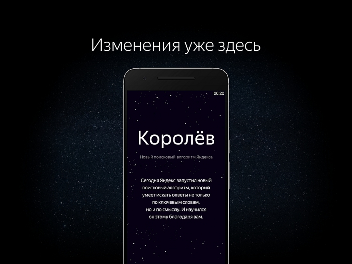 Новый алгоритм ранжирования «Королев» назван в честь отца советской космонавтики Сергея Павловича Королева. Изображение с космической тематикой сразу после презентации появилось на главной странице «Яндекса».