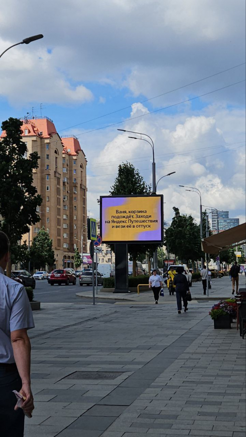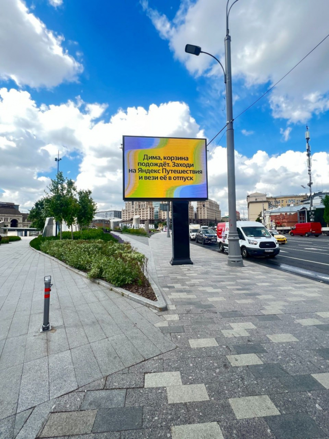 Компания разместила напротив рекламы Wildberries билборды с призывом к мужчинам отвезти свою девушку в отпуск. «Дима, корзина подождёт. Заходи на "Яндекс Путешествия" и вези её в отпуск» — гласит слоган новой рекламной кампании.